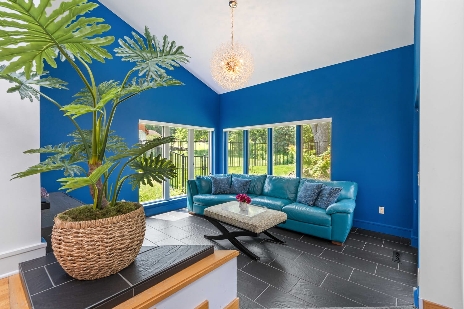 We drenched the walls in a deep ocean-blue that brought instant soul and grounding. In came a teal sectional, the kind you want to curl into with a book, a movie, or a heart-to-heart. It hugs the corner and says, “Come stay a while.”