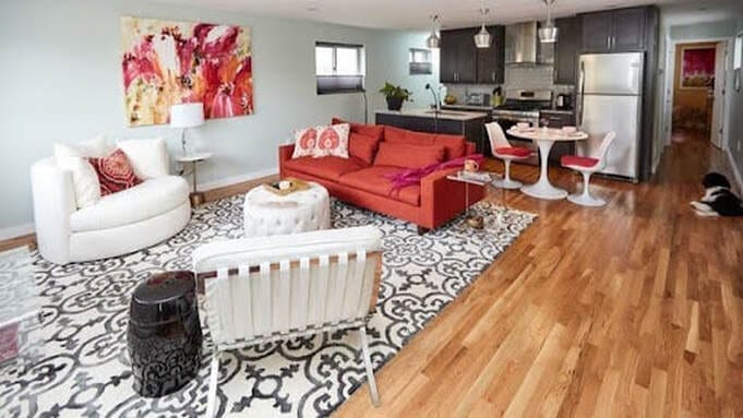 In this space we have dashes of Fire energy--red and orange in the sofa, art, pillows--balanced with Metal energy (pastel paint color, white accent chairs), Wood element in the flooring, Earth energy in the shape of the long horizontal sofa. A huge mirror (that you can’t see--right behind the photographer) represents Water energy. The room feels welcoming and balanced and the fire energy brings the sparkle ✨