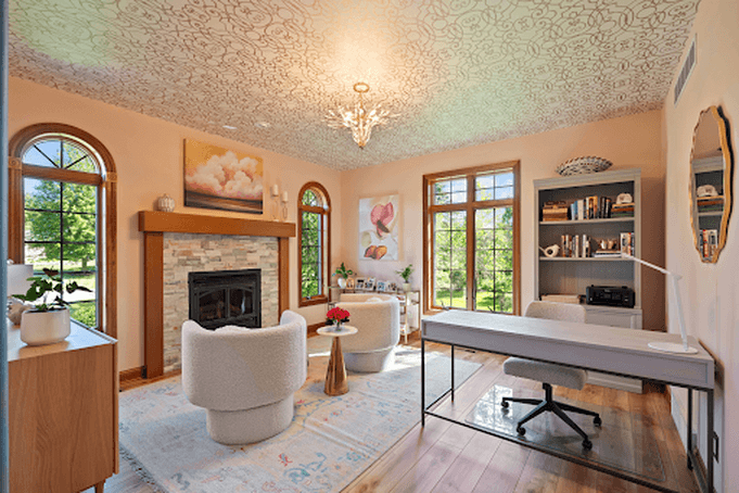 *To bring the energy UP, consider beautiful ceiling lighting and even (as in this case) wallpaper on the ceiling!